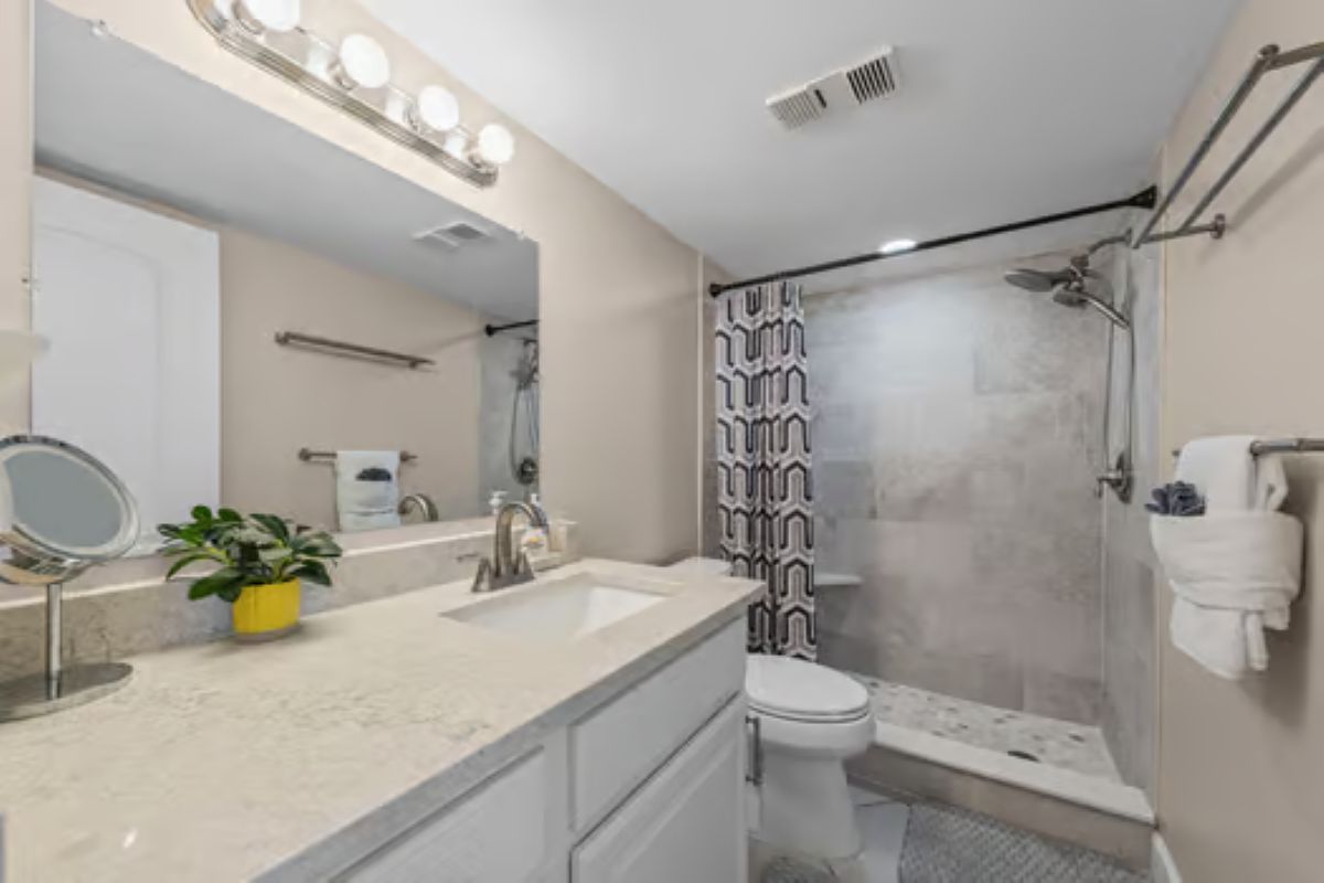 The bedroom has a beautiful king size bed and a full size dresser for all your belongings and a room divider for added privacy. The private bathroom has a walk in shower only.